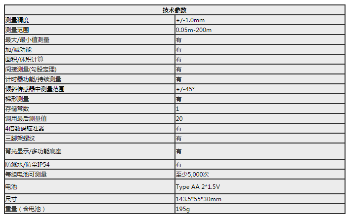 D5 激光測(cè)距儀詳細(xì)參數(shù): Leica DISTO D5激光測(cè)距儀是您進(jìn)行戶外測(cè)量的強(qiáng)檔助手;Leica DISTO D5激光測(cè)距儀測(cè)量距離為0.05~200M。 Leica DISTO D5激光測(cè)距儀戶外測(cè)量的強(qiáng)檔助手 集數(shù)字激光點(diǎn)跟蹤(4倍放大),2.4“超大彩屏、高達(dá)±45 ° 傾角傳感器于一身的激光測(cè)距儀! Leica DISTO D5激光測(cè)距儀具有多種可簡(jiǎn)易測(cè)量的功能和特點(diǎn),尤其針對(duì)戶外工作!